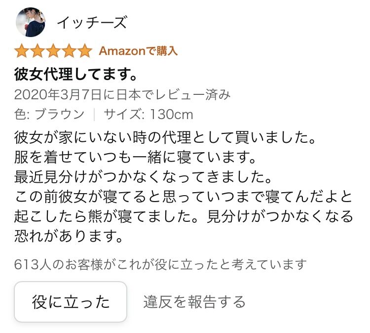彼女代理をぬいぐるみにさせているユーザーレビューに爆笑www 2022年02月27日 【Amazon 爆笑レビュー】特大くまのぬいぐるみを購入したユーザーのレビューが絶妙に面白かったのでご紹介します! ↓↓↓↓↓彼女代理してます。彼女が家にいない時の代理として買いました。服を着せていつも一緒に寝ています。最近見分けがつかなくなってきました。この前彼女が寝てると思っていつまで寝てんだよと起こしたら熊が寝てました。見分けがつかなくなる恐れがあります。 < 前の記事次の記事 > コメント コメントフォーム 名前 コメント 記事の評価 リセット リセット 顔 星 情報を記憶 コメントを投稿する