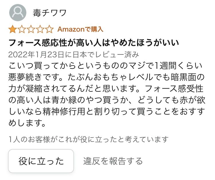 ライトセーバーから放たれたフォースのダークサイドへ取り込まれてしまったユーザーレビューにワロタwww 2022年02月27日 【Amazon 爆笑レビュー】スター・ウォーズのエレクトロニックライトセーバーを購入したユーザーのレビューが絶妙に面白かったのでご紹介します! ↓↓↓↓↓フォース感応性が高い人はやめたほうがいいこいつ買ってからというもののマジで1週間くらい悪夢続きです。たぶんおもちゃレベルでも暗黒面の力が凝縮されてるんだと思います。フォース感受性の高い人は青か緑のやつ買うか、どうしても赤が欲しいなら精神修行用と割り切って買うことをおすすめします。 < 前の記事次の記事 > コメント コメントフォーム 名前 コメント 記事の評価 リセット リセット 顔 星 情報を記憶 コメントを投稿する