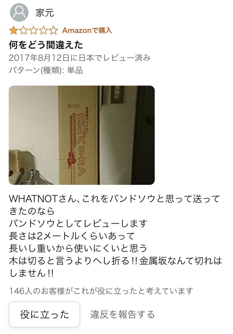 業者の発送ミスでユーザーに届いた商品をそのままレビューに投稿するユーザーに爆笑www 2022年02月27日 【Amazon 爆笑レビュー】プロクソン(PROXXON)のミニバンドソウを購入したユーザーのレビューが絶妙に面白かったのでご紹介します! ↓↓↓↓↓何をどう間違えたWHATNOTさん、これをバンドソウと思って送ってきたのならバンドソウとしてレビューします長さは2メートルくらいあって長いし重いから使いにくいと思う木は切ると言うよりへし折る‼金属坂なんて切れはしません‼ < 前の記事次の記事 > コメント コメントフォーム 名前 コメント 記事の評価 リセット リセット 顔 星 情報を記憶 コメントを投稿する