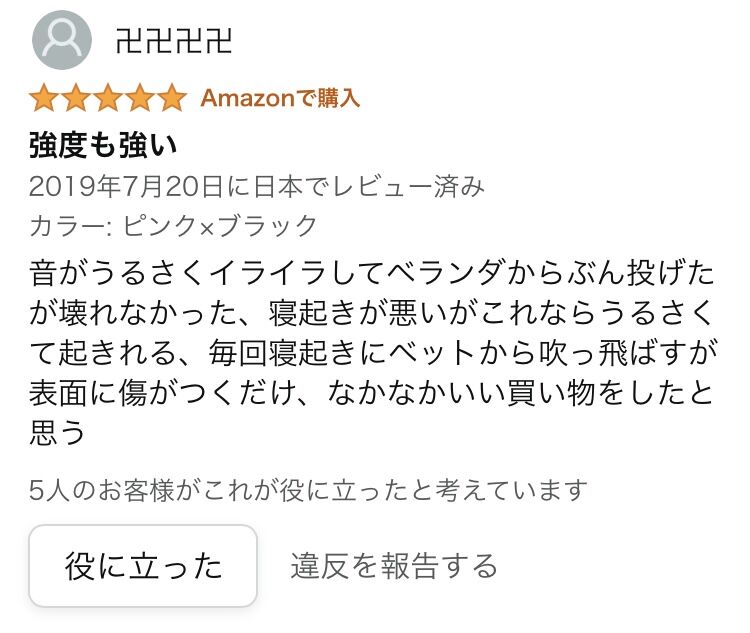 G-SHOCKもビックリなセイコー目覚まし時計の強度が分かった爆笑ユーザーレビューがコチラ👉 2022年02月28日 【Amazon 爆笑レビュー】SEIKO CLOCK(セイコー クロック) 目覚まし時計 RAIDEN(ライデン)を購入したユーザーのレビューが絶妙に面白かったのでご紹介します! ↓↓↓↓↓強度も強い音がうるさくイライラしてベランダからぶん投げたが壊れなかった、寝起きが悪いがこれならうるさくて起きれる、毎回寝起きにベットから吹っ飛ばすが表面に傷がつくだけ、なかなかいい買い物をしたと思う < 前の記事次の記事 > コメント コメントフォーム 名前 コメント 記事の評価 リセット リセット 顔 星 情報を記憶 コメントを投稿する