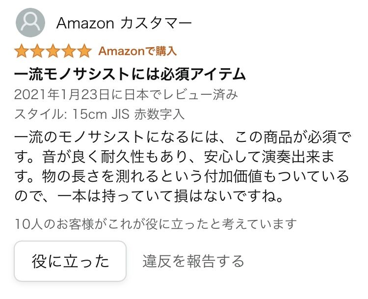 一流のモノサシストになるには、この商品が必須です。音が良く耐久性もあり、安心して演奏出来ます。物の長さを測れるという付加価値もついているので、一本は持っていて損はないですね。