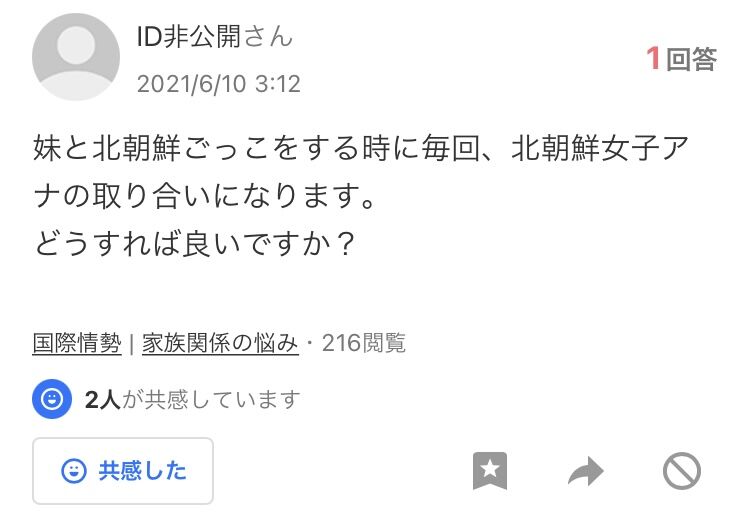 【争奪戦】北朝鮮ごっこ!人気アナウンサー役の取り合いに解決策見つかるwwww 2022年03月07日 【Yahoo!知恵袋 爆笑Q&A】「北朝鮮ごっこ」について、ベストアンサーが絶妙に面白かったのでご紹介します! Q.妹と北朝鮮ごっこをする時に毎回、北朝鮮女子アナの取り合いになります。どうすれば良いですか? ↓↓↓↓↓A.人気なので交代でやれば良いと思いますよ。質問者からのお礼コメントボクはなくなくミサイル役になりました… < 前の記事次の記事 > コメント コメントフォーム 名前 コメント 記事の評価 リセット リセット 顔 星 情報を記憶 コメントを投稿する